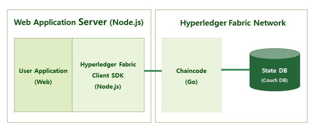 프로젝트의 시스템 아키텍쳐이다. Hyperledger Fabric으로 네트워크를 구성하고 네트워크에 원장이 저장되는 DB를 구축하고 기부금 사용정보를 원장에 저장하게 하는 Chaincode를 go언어로 개발하였다.