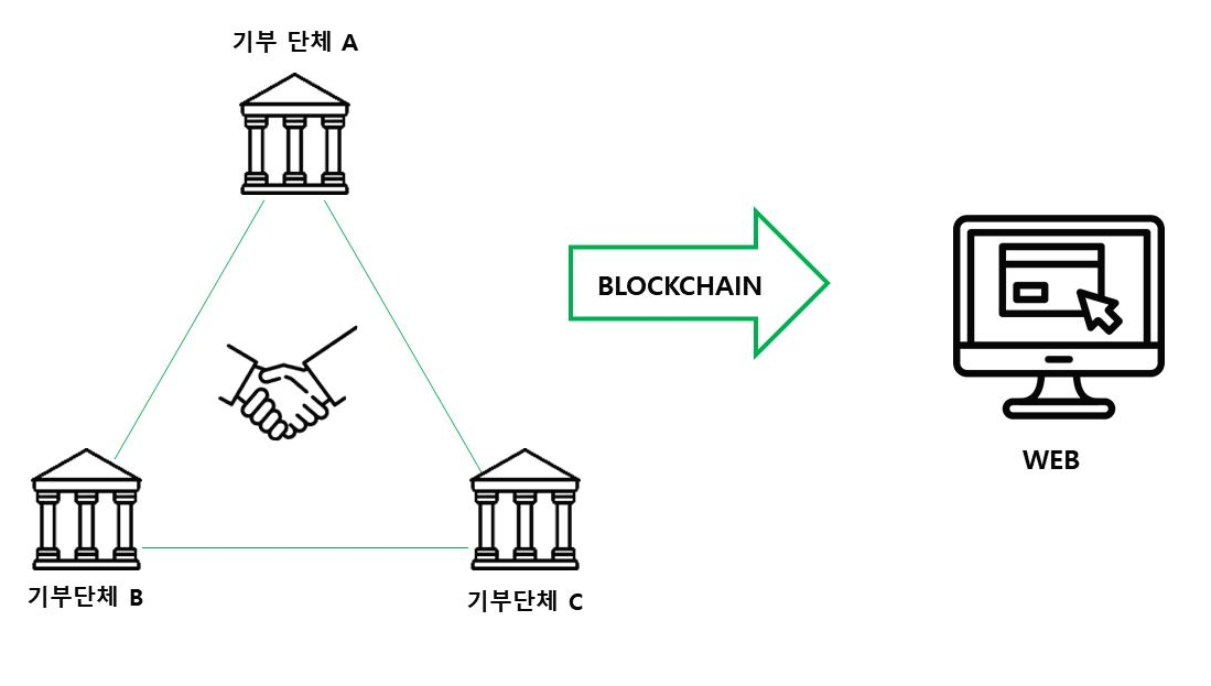 3개의 기부단체가 협약을 맺었다고 가정하였다. 3개의 기부단체가 하나의 Hyperledger Fabric 블록체인 네트워크를 구성하여 기부금 정보가 분산원장에 저장된다.